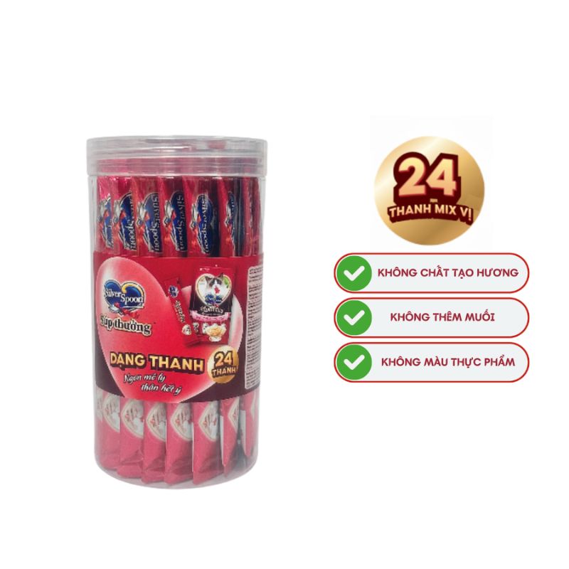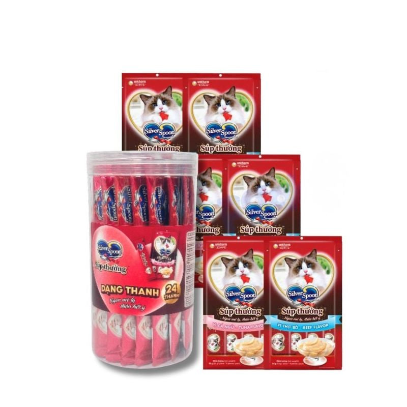 Súp thưởng cho mèo Silver Spoon dạng thanh được làm từ 100% thịt cá tươi thật, mang đến hương vị thơm ngon, bổ dưỡng và an toàn cho sức khỏe mèo. Sản phẩm được sản xuất tại Thái Lan theo nguyên liệu, quy trình, tiêu chuẩn Nhật Bản. Với 6 hương vị đa dạng, dễ dàng chiều lòng mọi khẩu vị, đóng gói tiện lợi 4 thanh/túi, là món thưởng hấp dẫn và tốt cho mèo cưng mỗi ngày.
